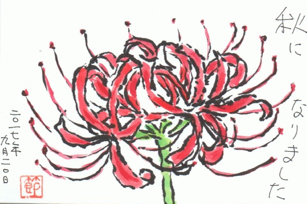 彼岸花 絵手紙 なまえはその通りなのですが、 毎年お彼岸になれば、きちんと咲くのが不思議です。 きまじめというか、律儀というか、 それとも愚直というのでしょうか。 ことしも、お彼岸になりました。 京都に墓参りに行ってきます。